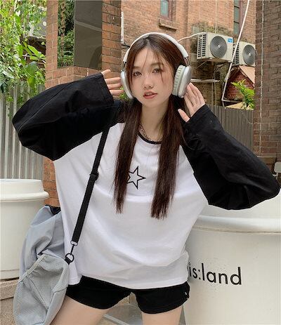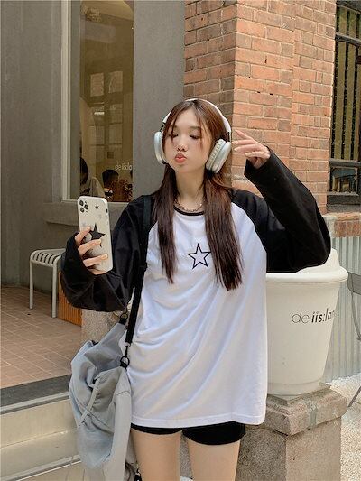 2024秋冬tシャツ バイカラー ラグランスリーブ スター 星 オーバーサイズ トップス ロンT 長袖 ゆったり 体型カバー カジュアル レトロ 韓国ファッション レディース