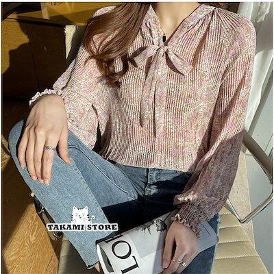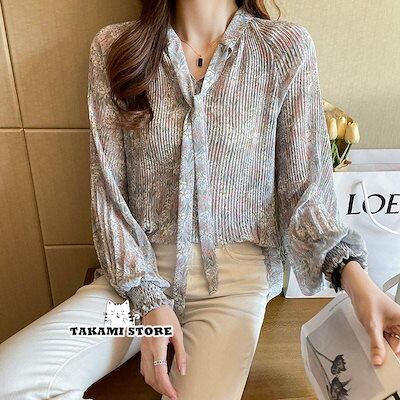 【制服標準装備】シャツ ブラウス 春夏 秋 シフォン レディース バルーン袖 花柄 リボン 長袖 シャツ オフィス トップス 通勤 スーツ インナー ビジネス 入学式
