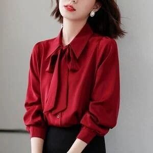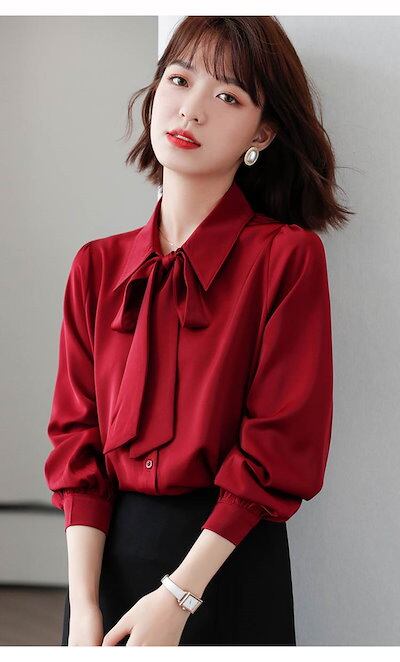 トップス レディース ブラウス 個性的 長袖 Vネック 襟付き リボン タイ 無地 赤 白 S M L XL 2XL 春 夏 秋 上品 きれいめ おしゃれ シンプル カジュアル ナチュラル