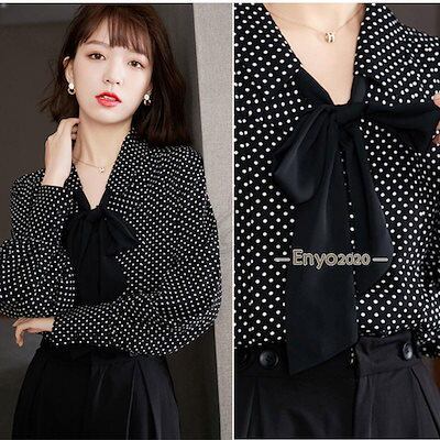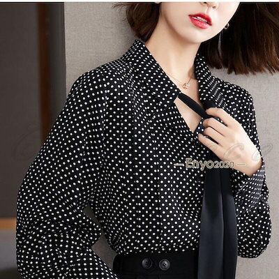 トップス シフォンブラウス レディース 長袖 水玉柄 ドット柄 シャツ リボン 上品 黒 フォーマル オフィス カジュアル 春夏秋 きれいめ おしゃれ