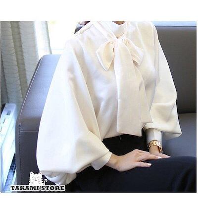 ブラウス レディース オフィス フォーマル 40代 秋 おしゃれ 白 パフスリーブ シフォン 長袖シャツ リボン 韓国風 トップス 通勤 大人 ゆったり 2色