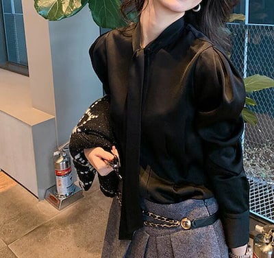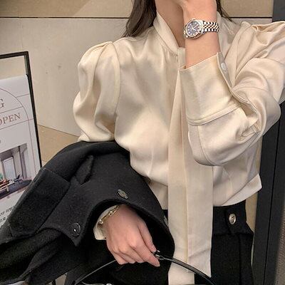 ブラウス ボリューム袖 レディース 長袖 秋 春 冬 トップス シャツ レディース 長袖 きれいめ オフィスカジュアル 無地 春夏 リボン つや感 シースルー リボンカラー ママコーデ 韓国 韓国フ