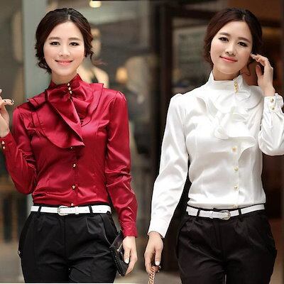 シャツ ブラウス レディース リボン トップス フリルブラウス 長袖 無地 エレガント オフィス 落ち感 魅力 お洒落 プルオーバー