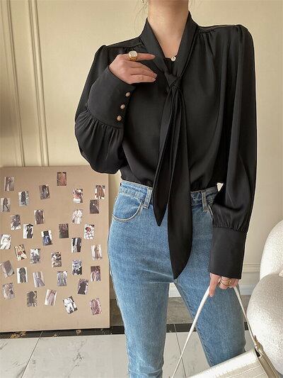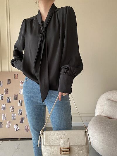 サテン ブラウス ボウタイ フォーマル ブラウス レディース コーデ 秋 春 オフィス 長袖 リボン トップス シャツ ブラウス レディース 長袖 スーツ インナー 春 夏 秋 シンプル 体型カバー