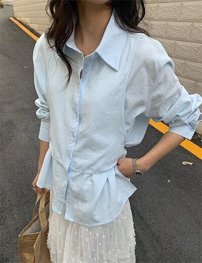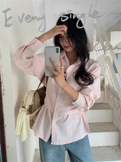 フェイクレイヤード シャツ レディース ブラウス 長袖 綿 フェミニン 上品 切り替え トップス シャツブラウス ゆったり スーツインナー オフィス フォーマル サイドスリット リボン付き 大人 お洒