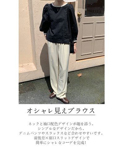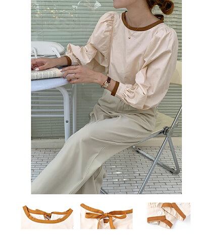配色 ブラウス 白 長袖 プルオーバー シャツ レディース 春夏 ゆったり シャツブラウス バックリボン ラウンドネック ぽわん袖 長袖ブラウス ドルマン バルーン袖 ギャザー 前後差 スリット カッ