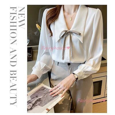 ブラウス レディース 長袖ブラウス 新作 オフィスブラウス 白折り襟 リボン オシャレブラウス