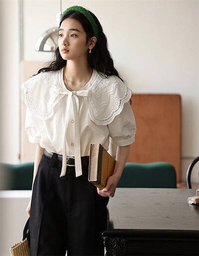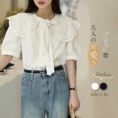 シャツ レディース 半袖 春 夏 秋 春夏秋 シャツブラウス レディースシャツ 無地 ビッグカラー リボン ギャザー パフ袖 パフ袖 可愛い カワイイ 若見え エレガント 配色 レイヤード 重ね着 カ