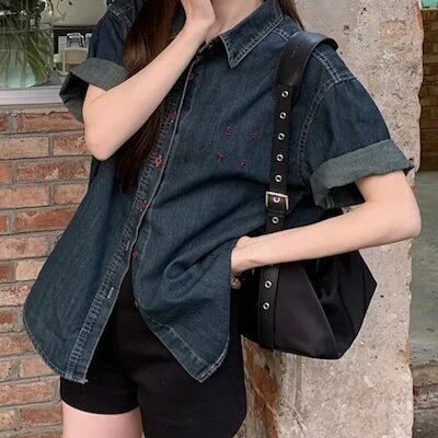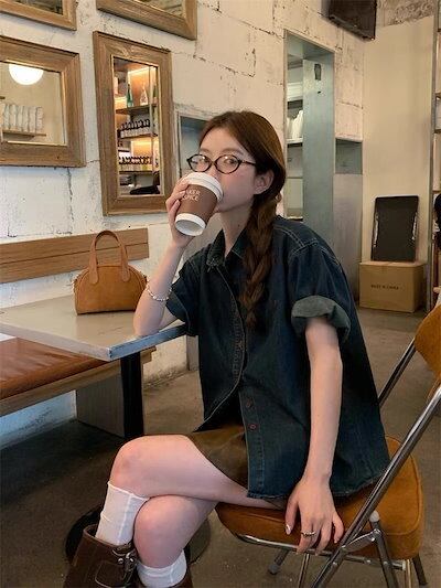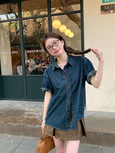 【1つ買うと1つ無料】24トップス デニムシャツ 半袖 ボタン 襟 スタンダードカラー ゆったり おしゃれ かわいい カジュアル 韓国ファッション レディース お出かけ