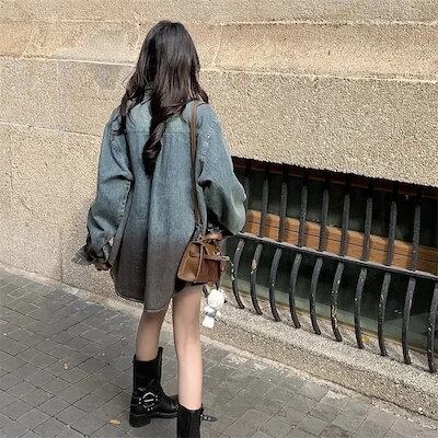 【裕福になる】24トップス シャツ デニム生地 グラデーション ボタン 襟 グレー 長袖 ゆったり 丈長め かわいい おしゃれ 韓国ファッション レディース お出かけ