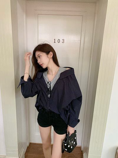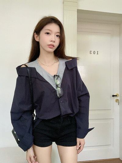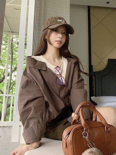 2024秋冬トップス シャツ ボタン 重ね着風 二枚重ね 長袖 ゆったり 秋 茶色 黒 おしゃれ かわいい 韓国系ファッション レディース お出かけ