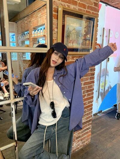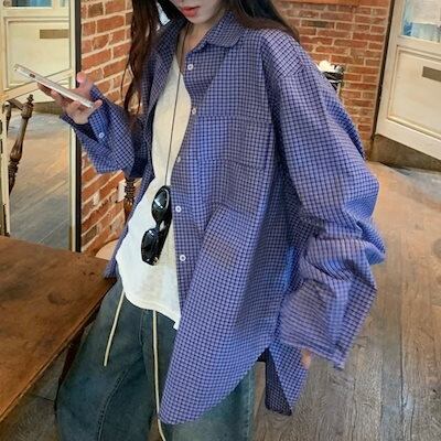 2024秋冬トップス シャツ 長袖 チェック柄 ボタン 襟 スタンダードカラー 秋 青 ブルー おしゃれ かわいい きれいめ 大人っぽい 韓国ファッション レディース お出かけ