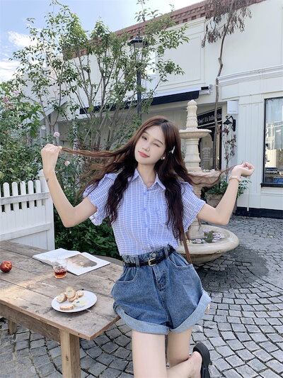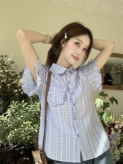 2024 春夏トップス シャツ 半袖 ボタン 襟 スタンドカラー ゆったり ギンガムチェック柄 夏 青 かわいい おしゃれ ガーリー 甘め カジュアル 韓国ファッション レディース お出かけ