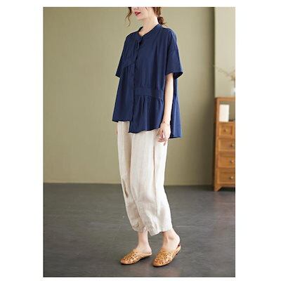 シャツ 半袖 ゆったり レディース 無地 綿 夏新作 不規則 前後差 前開き ボタン留め 自然に体型カバー 通気性いい シンプル 大きいサイズ