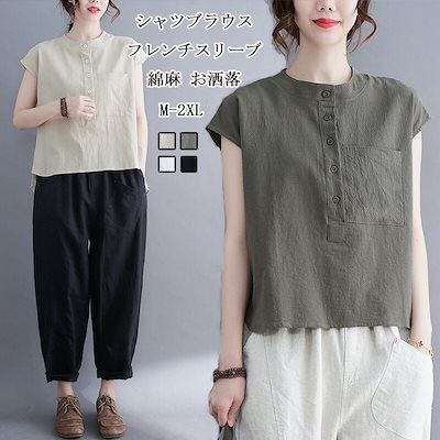 綿麻風 ブラウス レディース 春夏 シャツブラウス 半袖 プルオーバー フレンチスリーブ クルーネック ベーシック ボタン ポケット 無地 トップス 大きいサイズ ゆったり シャツ 体型カバー 大人可