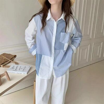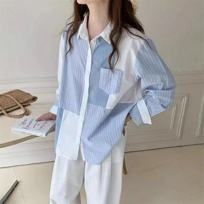 長袖シャツ ブラウス レディース 春 夏 長袖 シャツ シャツブラウス 綿 長袖ブラウス 折り襟 シャツ 切り替え デザイン トップス 配色 前開き ボタン留め 無地 ストライプ 通勤 大人おしゃれ