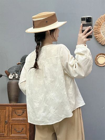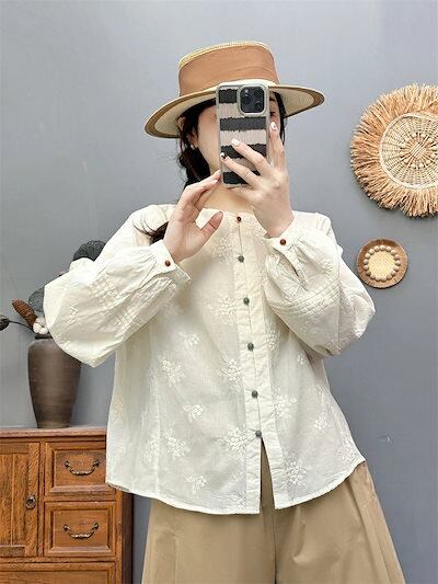 長袖 ブラウス トップス 刺繍 シャツ レディース チュニック 春 長袖ブラウス 長袖トップス 綿 春 配色 コットン シャツブラウス 前開き ボタン留め 夏 刺繍ブラウス ゆったり 体型カバー 通気