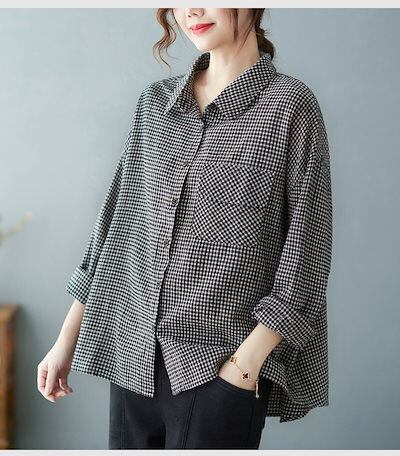シャツ ブラウス トップス レディース 長袖 チェック柄 長袖シャツ リネン シャツブラウス 秋 コットン ゆったり 大きいサイズ 体型カバー カットソー 重ね着 折り襟 ボタン留め おしゃれ 前開き