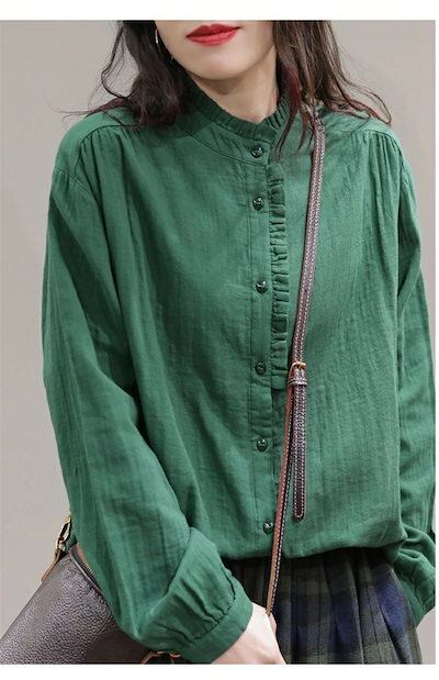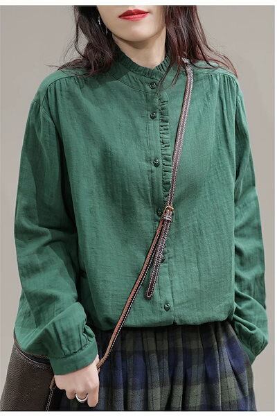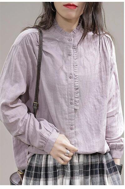 長袖ブラウス レディース 春 夏 シャツブラウス 長袖 ブラウス 綿混 シャツ シャツブラウス トップス プチハイネック 縁飾り インナー 前開き ボタン留め 無地 通勤 おしゃれ 大人 カジュアル