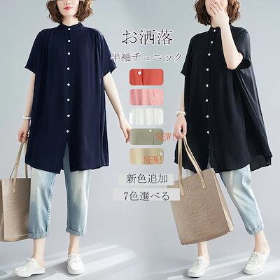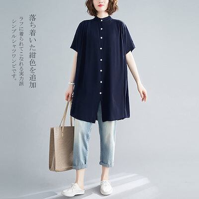 チュニック シャツブラウス レディース ロングシャツ シャツ トップス 半袖シャツ アウター ブラウス 半袖 夏 無地 ボタン止め 羽織 ギャザー入り ゆったり 着まわし 春 薄手 夏 シンプル カ