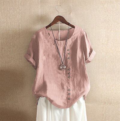 半袖シャツ レディース トップス ブラウス シャツブラウス 無地 大きいサイズ 半袖 シャツ ブラウス 綿混 夏 ラウンドネック 綿麻風 コットンリネン ゆったり チュニック シンプル ボタン飾り カ