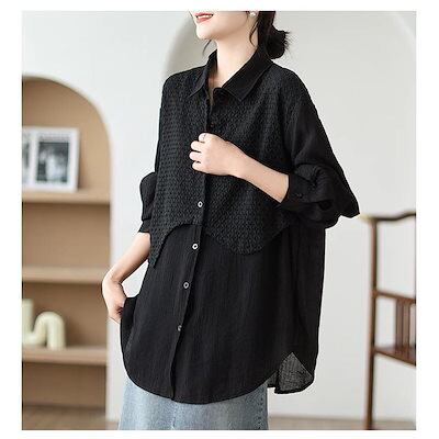 ゆったりシャツ トップス ナチュラルな風合い 前開き 折り襟 異素材 切り替え 大きいサイズ ボタン留め 際立つデザイン 長袖 レディース 春新作