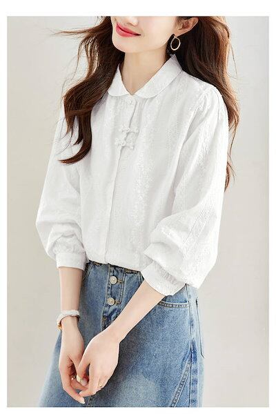 丸襟 シャツ ブラウス 長袖 花柄 刺繍 秋 春 冬 シャツブラウス レディース ブラウス チャイナボタン トップス 白シャツ 長袖シャツ 大きいサイズ 上品 きれいめ フォーマル カジュアル ナチ