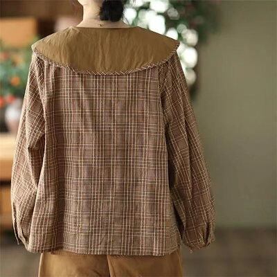 シャツ ブラウス 襟刺繍 春新作 折り襟 前開き 綿 チェック柄 レディース トップス 長袖 可愛さよりアップ お洒落 ボタン留め 大きいサイズ