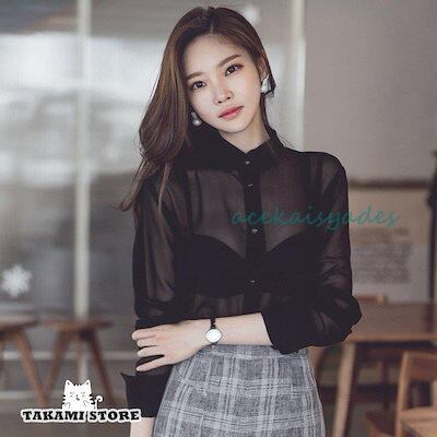 シースルー シャツ ブラウス トップス レディース シフォン 長袖 大きいサイズ 前ボタン 透け感 黒 ブラック 韓国ファッション