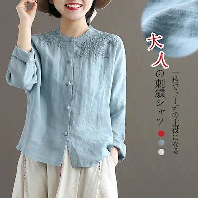 シャツ 刺繍 ブラウス レディース 長袖 シャツブラウス ノーカラー 綿麻風 長袖シャツ きれいめ おしゃれ 綿麻シャツ ゆったり ナチュラル カジュアルシャツ 前開き ボタン留め ノーカラーシャツ