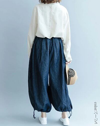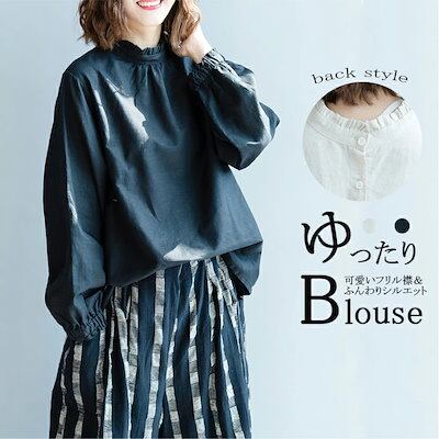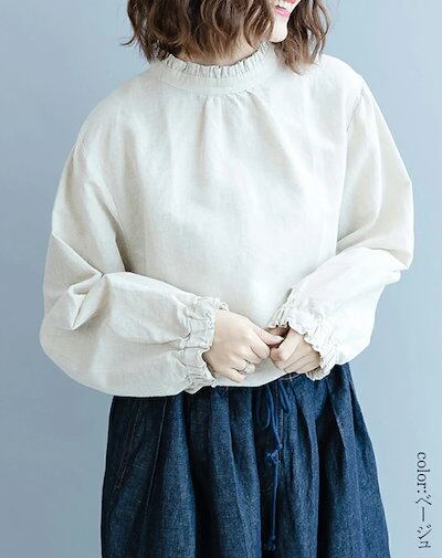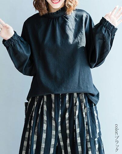 フリル ブラウス 立ち襟 シャツ 綿麻風 レディース 長袖 ふんわり ボリューム シャツブラウス バックボタン 大きいサイズ 体型カバー 長袖ブラウス フリル襟 フレンチスリーブ