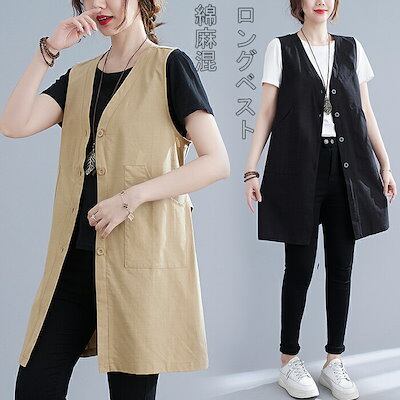 ロングベスト レディース 春夏 Vネック ジレ レディース トップス ベスト ロング丈 ロングジ アウター サマージャケット ノースリーブ 羽織り オフィス カジュアル 体型カバー 通勤 OL 綿麻混