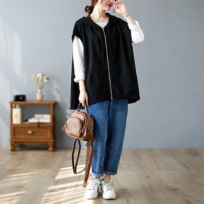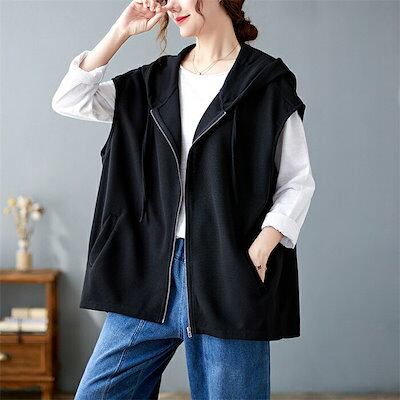 ベスト ジレ レディース トップス ノースリーブ アウター レイヤード パーカー 春 秋 前開き トップス フード付き ジップアップ パーカーベスト フード付きパーカー ゆったり カットソー 重ね着