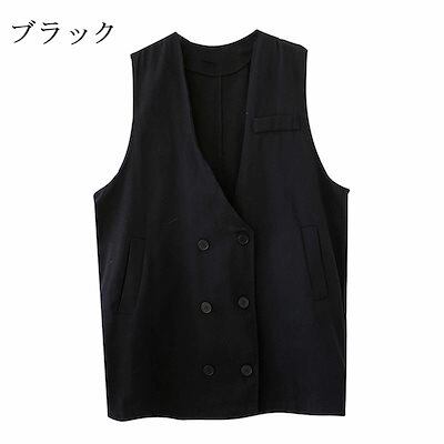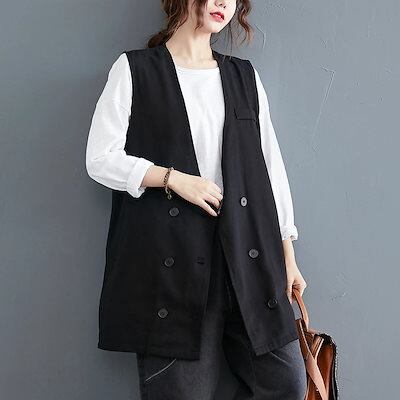 ロングベスト レディース ベスト 春 夏 トップス 綿 コットン Vネック ジレ 前開き ミドル丈 ロング ダブルボタン ブラック アウター 重ね着 レイヤード サイドポケット ノースリーブ ジャケッ