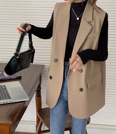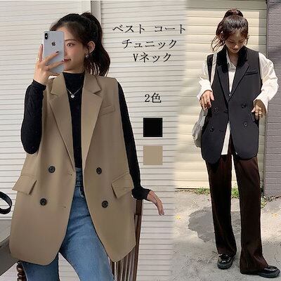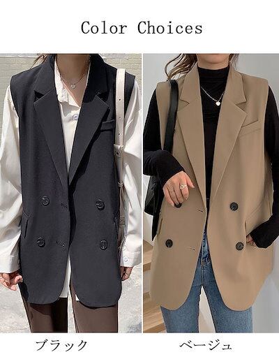 ベスト レディース 春 ジレ 前開き Vネック トップス チュニック 無地 ジレンチ 折り襟 フラップポケット ダブルボタン スーツベスト ノースリーブ ジャケット 羽織 コート ブラック ベージュ
