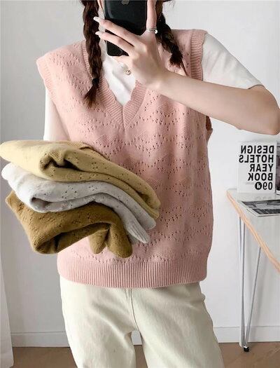 ニットベスト レディース 春 秋 ニット ベスト ノースリーブ Vネック 透かし トップス プルオーバー 重ね着 レイヤード コーデ セーター 無地 ゆったり カジュアル ニットセーター シンプル ア