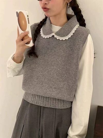 丸襟 ベスト レディース 冬 春 秋 レース襟 可愛い ファッション ニットベスト 大きいサイズ 秋冬 きれいめ ニット お洒落 上着 暖か トップス おしゃれ ノースリーブ シンプル プルオーバー