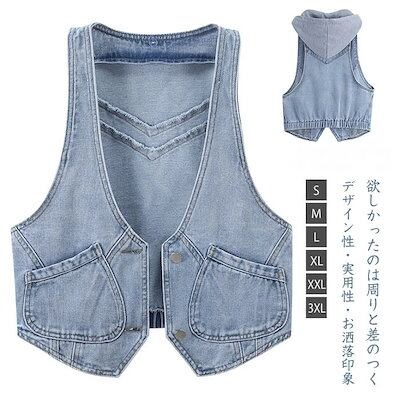 デニム ベスト レディース 春 ジレ ベスト レディース 春夏 ベスト レディース おしゃれ ベスト 春 デニム 前開き トップス ベスト Gジャン 可愛い フード付き 取り外し可能 大きいサイズ 個