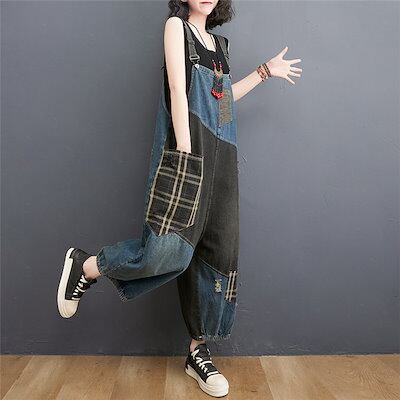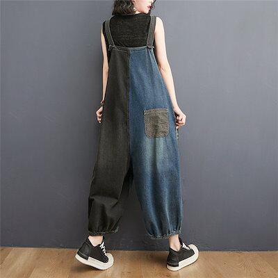 デニムサロペット レディース ロングパンツ オーバーオール オールインワン バイカラー ハイウエスト ポケット付き 体型カバー 春夏秋
