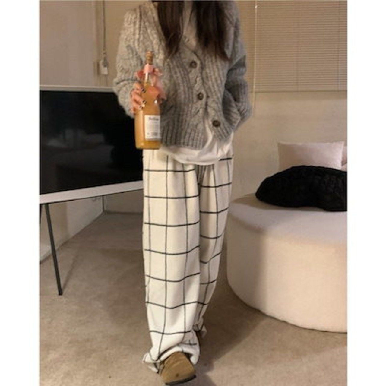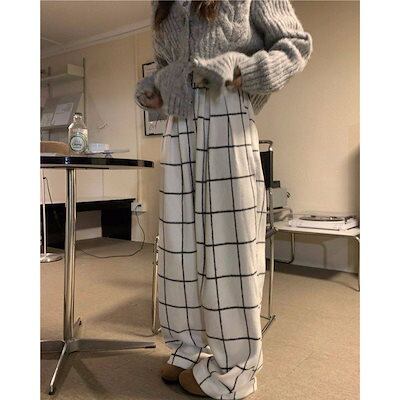 レトロファーファー磨きチェックカジュアルパンツレディース春冬新作厚手ストレートワイドパンツモップパンツ