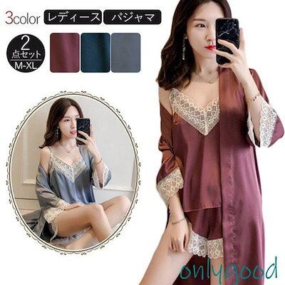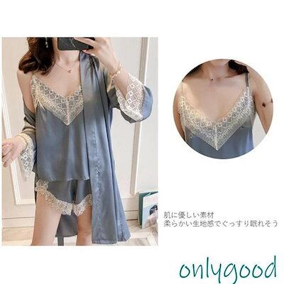 人気パジャマ ルームウェア 部屋着 レディース 夏 春 ガウン キャミソール 短パン ショートパンツ 三点セット セットアップ サテン風 レース Vネック 大き