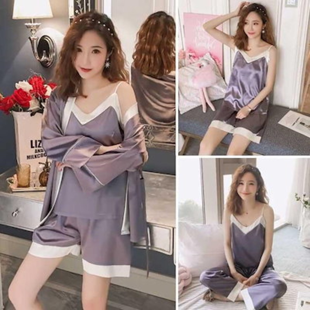 【お得】ショートパンツ ルームウェア ナイトウェア かわいい ロングパンツ サテン ガウン レディース キャミソール 春 女性 夏 冷感 4点セット 涼しい大好評
