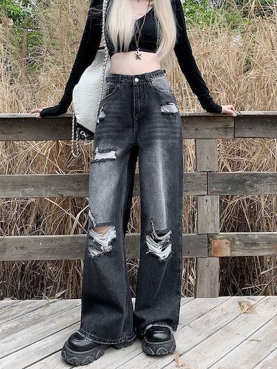 人气 新作 デニムパンツ ブラック 穴 ジーンズ レディース 春秋 ストレート ルーズ ワイドパンツ
