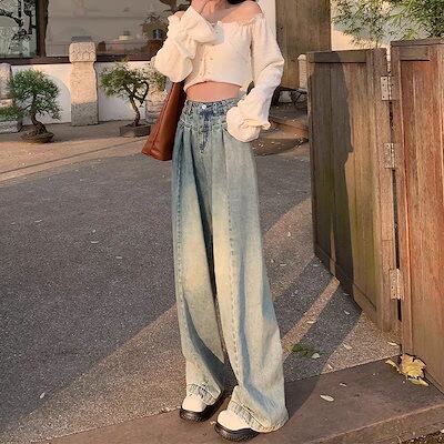 デニムパンツ ヴィンテージストレートジーンズ レディース新作 ハイウエストドレープワイドパンツ
