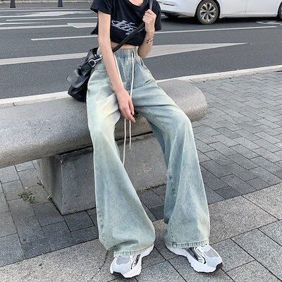 【3日以内出荷】デニムパンツ ウエストゴム ワイドパンツ ジーンズ レディース 秋の新作 ゆったり ハイウエスト 薄手 小さい モップパンツ 韓国