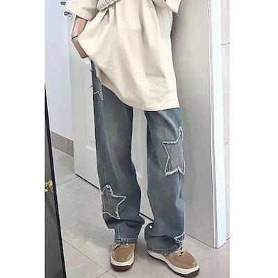 デニムパンツ 星 ワッペン バギーパンツ ワイドパンツ レディース デニム かわいい 貼り付け デザイン カジュアル ロングパンツ 大きいサイズ かっこいい