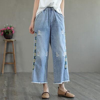 ジーンズ バギーパンツ ワイドパンツ 春 夏 秋 ダメージ ウォッシュ アンクル丈 刺繍 デニムパンツ レディース