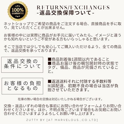 サイズ交換、お色交換などの返品、交換は行っておりませんので十分にお確かめの上、ご購入お願い致します。