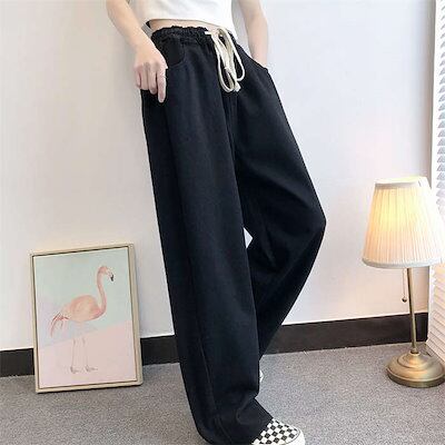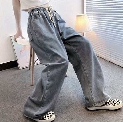 25新作 ワイドパンツ デニムパンツ レディース ボトムス ポケット付 ストレッチ ズボン ロング丈 無地 ひんやり ストレート ジーンズ ハイウエスト ウエストゴム ゆったり リラックス