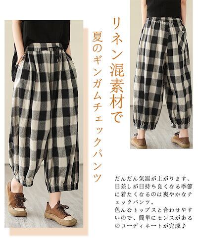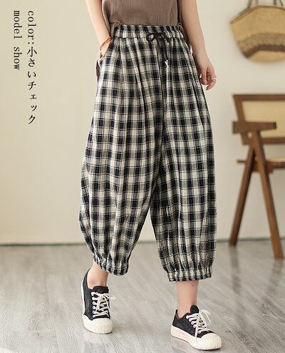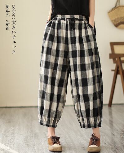 薄手 ゆったり 春夏 九分丈 アンクルパンツ 部屋着 リネン チェック レディース イージーパンツ テーパード ウェスト紐 チェックパンツ パンツ 可愛い ギンガムチェック 総ゴム ポケットサルエルパ